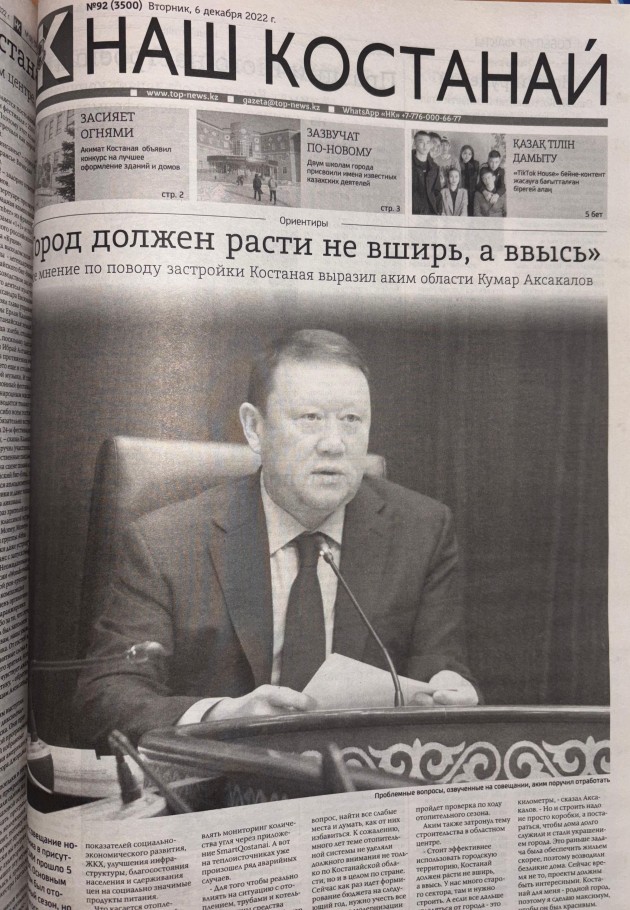 Три года назад на первой полосе вторничного номера от 6 декабря читателей встречала новость с первого заседания недавно назначенного акима Костанайской области Кумара Аксакалова. Напомним, его назначили 1 декабря 2022 года. На первом аппаратном совещании Аксакалов заявил, что Костанай должен расти не вширь, а ввысь, и призвал застройщиков создавать многоэтажные проекты. На данный момент в Костанае уже возведены 16-этажные дома, и в процессе постройки находится 19-этажное здание.
