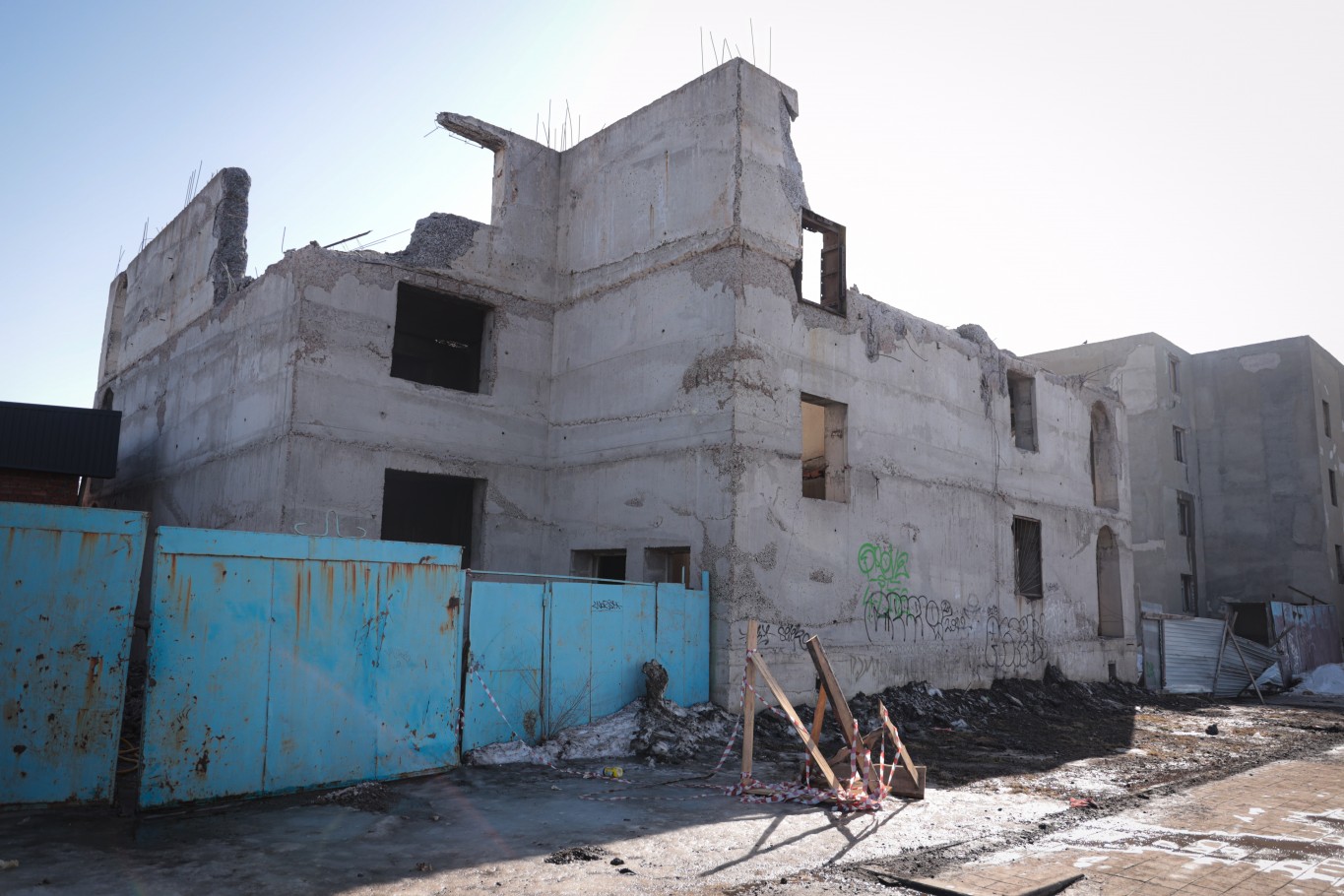 Не один десяток лет эти здания простаивали, создавая не самый лучший вид для жилого микрорайона. Осенью корреспонденты «НК» увидели на этой территории активно работающую технику и людей. Вокруг монолиток навели порядок, на зиму работы приостановились. С приходом весны территория снова оживилась: там стали разбирать одно из зданий.
