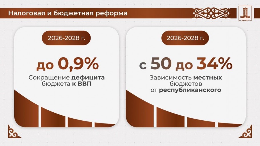 Налоговая и бюджетная реформа, позволила сформировать трехлетний бюджет страны без целевых трансфертов из Нацфонда, с планомерным сокращением дефицита бюджета до 0,9% к ВВП к 2028 году. Снижается зависимость местных бюджетов от республиканского с 50% в 2025 году до 34% – в 2028 году, — сказал Олжас Бектенов.