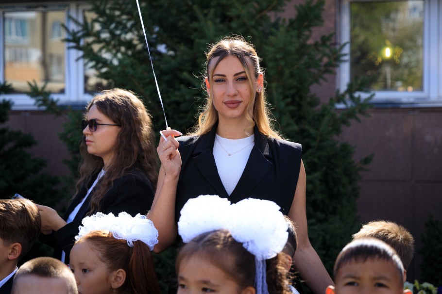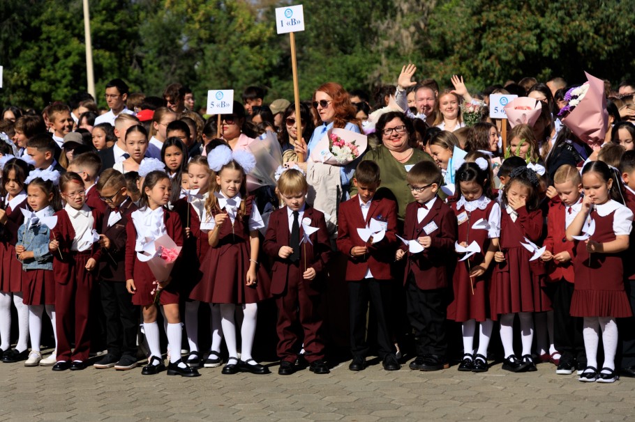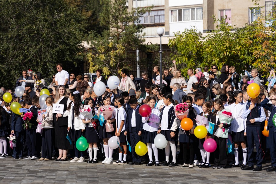 — Школа — это знания и традиции. В этом году наша дружная школьная семья пополнилась 142 первоклассниками — это их первый школьный праздник, — традиционно открыла линейку директор школы Ирина Шушпанова.
