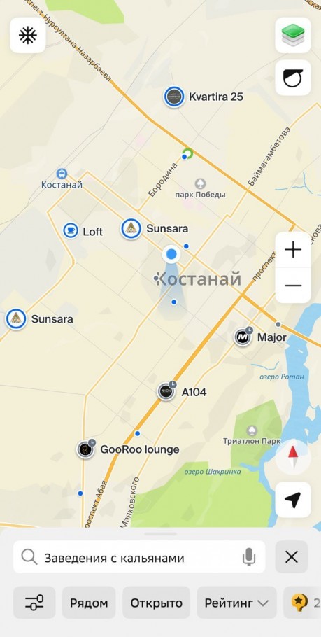 Кроме того, при обычном поиске в приложении 2ГИС по запросу «Заведения с кальяном» пользователю открывается целая карта Костаная, усыпанная десятками точек. В списке как новые заведения, так и те, о которых «НК» уже писал выше в ходе собственного рейда по соцсетям. Фактически информация о кальянах находится в свободном доступе, без каких-либо ограничений или оговорок, несмотря на действующий запрет. Возникает закономерный вопрос: если кальян официально запрещен, почему он продолжает так открыто фигурировать в навигационных сервисах как одна из привычных опций городского досуга.