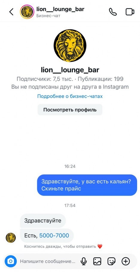 Были заведения, на чьих страницах Instagram мы не нашли упоминания кальяна, но спросили о его наличии в direct. О существовании такой услуги нам сообщили в @lion__lounge_bar, @loft_kosta, @sherlock.pub_karaoke_kst. Но были и те, кто заявили, что кальянов у них нет: @fessla_kostanay, @nehabar_kst.