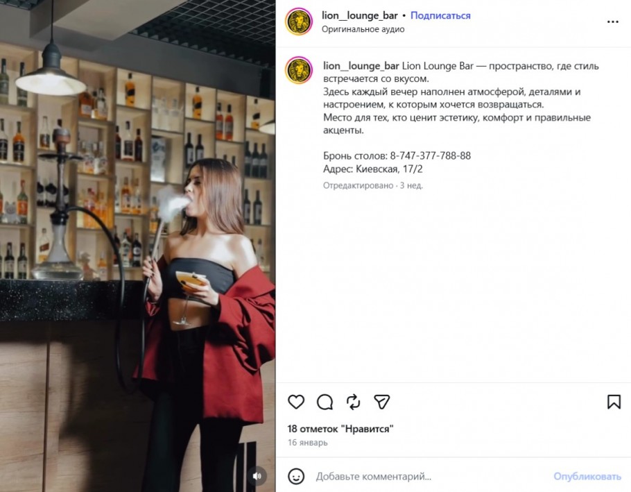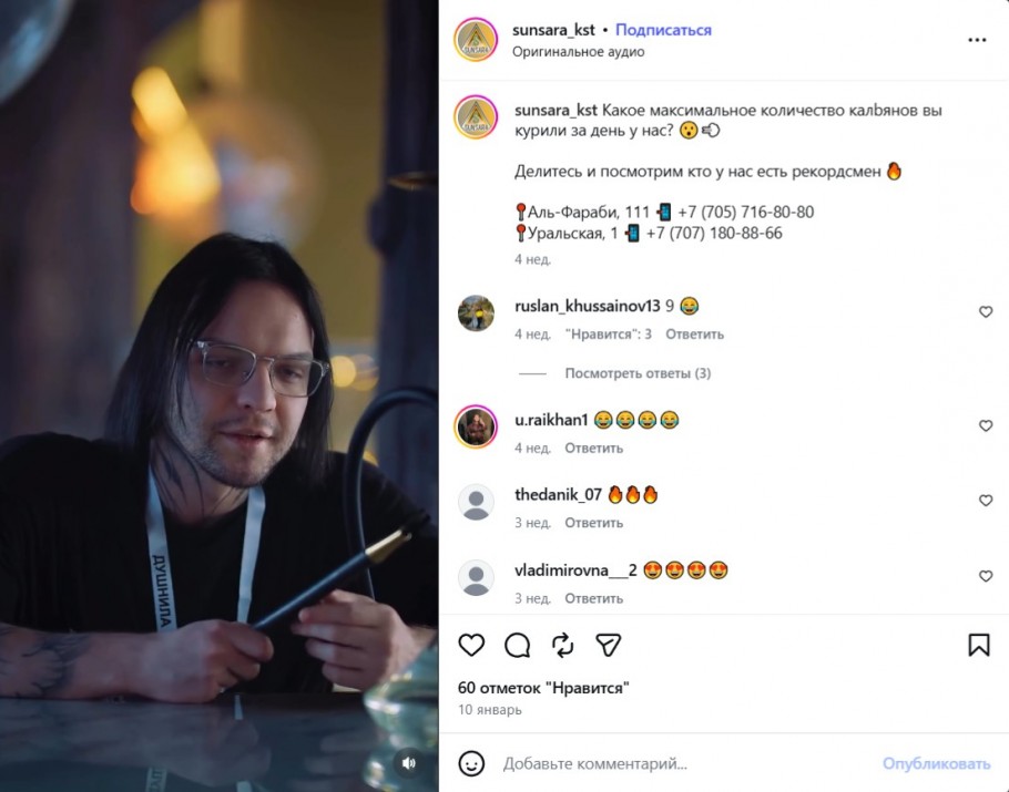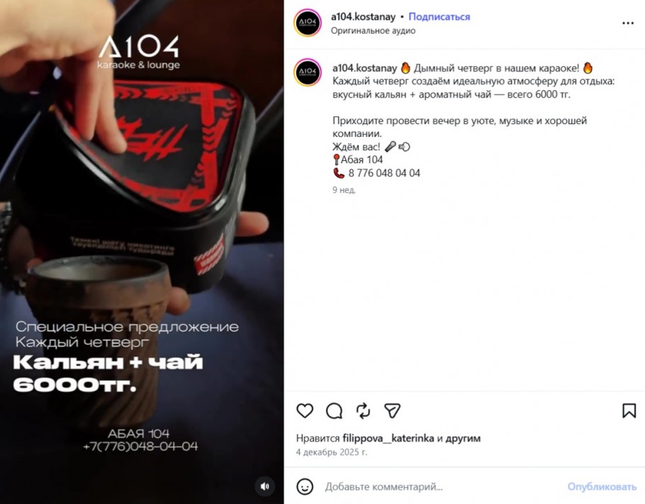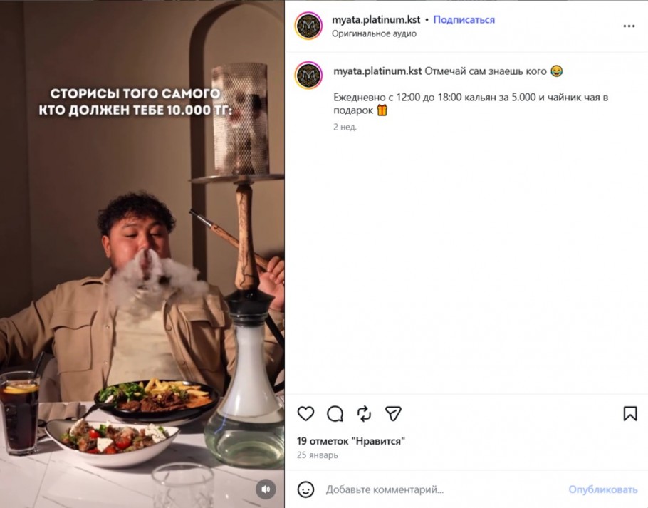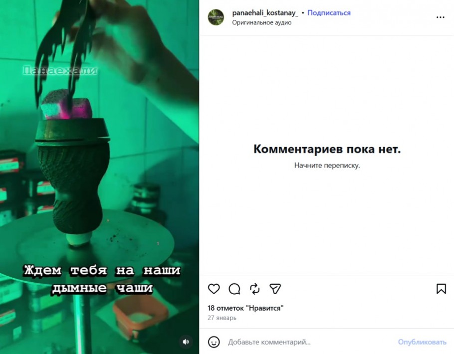 Еще одна категория – заведения, где кальян называют завуалированно. Название «дымный коктейль» фигурирует в рекламных постах аккаунтов @kvartira25.kst_, @benjamin_karaoke_kst. «Дымными чащами» кальян называют в @panaehali_kostanay_, @sezon_lounge.kst. А в @sunsara_kst не заморачивались и дымные устройства во всех постах называют «калbянами».