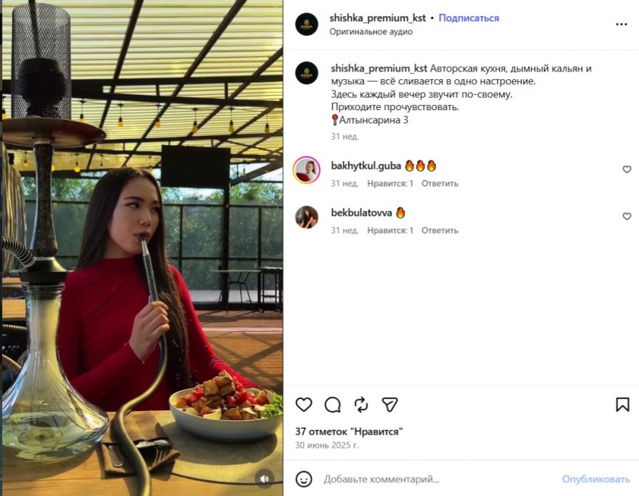 Ряд заведений не указывает кальян в меню, однако на страницах Instagram до сих пор размещены посты с прайсом. Например, в аккаунте @myata.platinum.kst мы нашли публикации с ценами на кальян за январь 2026 года, в @shishka_premium_kst – прайс в постах от июня 2025 года, @dionis_bar_kst – кальянное меню в публикациях от мая 2025 года, в @a104.kostanay и @sunsara_kst – упоминания кальянов и прайса в конце 2025 – начале 2026 года.