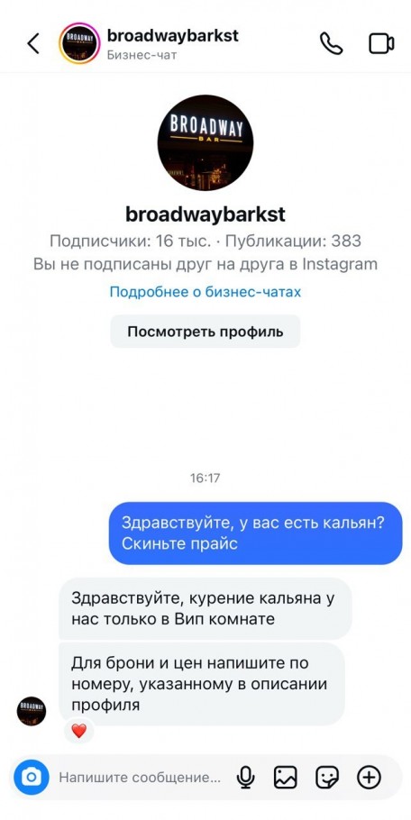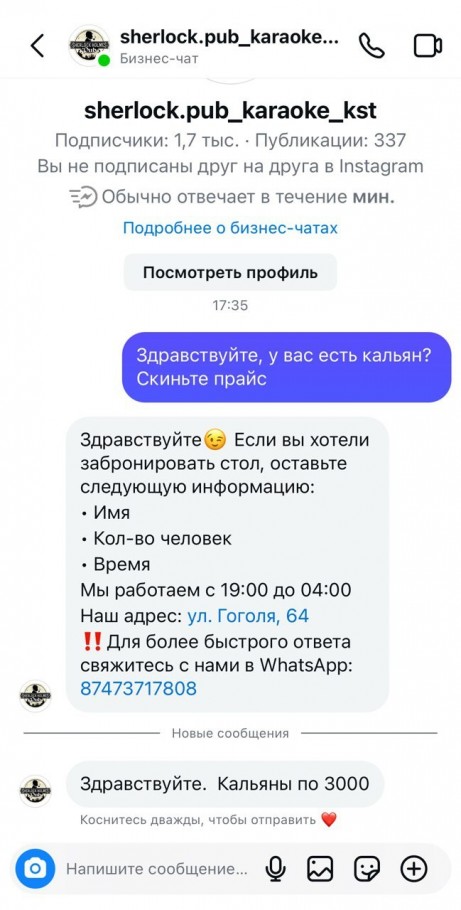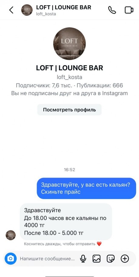 Были заведения, на чьих страницах Instagram мы не нашли упоминания кальяна, но спросили о его наличии в direct. О существовании такой услуги нам сообщили в @lion__lounge_bar, @loft_kosta, @sherlock.pub_karaoke_kst. Но были и те, кто заявили, что кальянов у них нет: @fessla_kostanay, @nehabar_kst.
