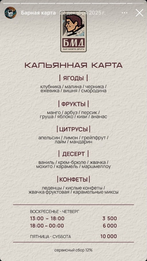 Отдельно стоит отметить @bar_moego_druga, где кальян прямо указан в меню и рекламируется на странице.