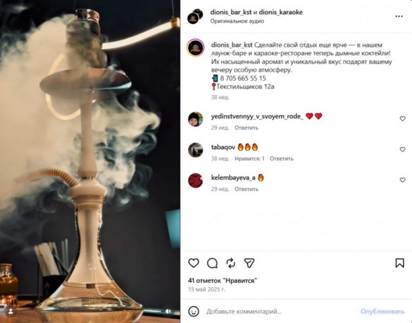 Ряд заведений не указывает кальян в меню, однако на страницах Instagram до сих пор размещены посты с прайсом. Например, в аккаунте @myata.platinum.kst мы нашли публикации с ценами на кальян за январь 2026 года, в @shishka_premium_kst – прайс в постах от июня 2025 года, @dionis_bar_kst – кальянное меню в публикациях от мая 2025 года, в @a104.kostanay и @sunsara_kst – упоминания кальянов и прайса в конце 2025 – начале 2026 года.