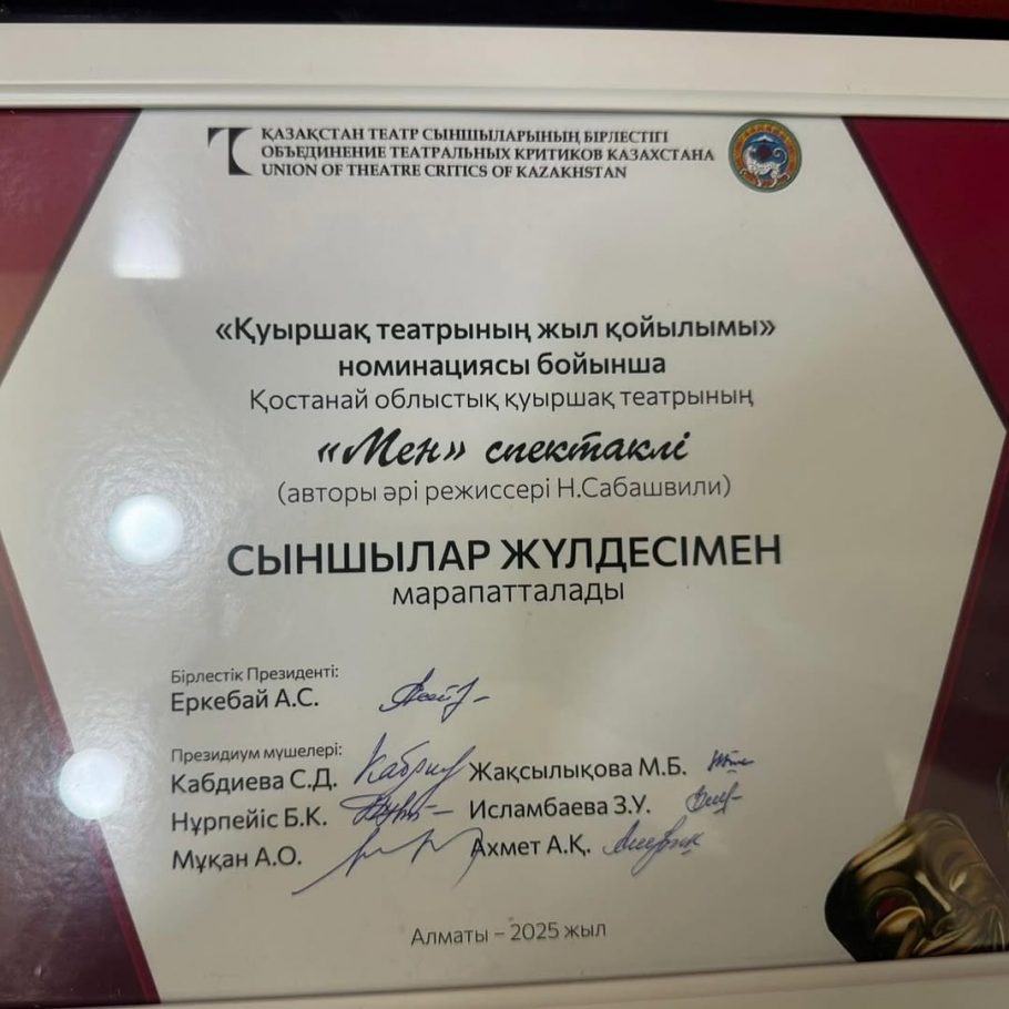Спектакль «MEN…» Костанайский областной театр кукол в постановке режиссера Н. Сабашвили был признан «Спектаклем года театра кукол». Победа принесла коллективу не только признание профессионального сообщества, но и сертификат на участие в Международном фестивале театров кукол, который пройдет в 2026 году в Анкаре (Турция).