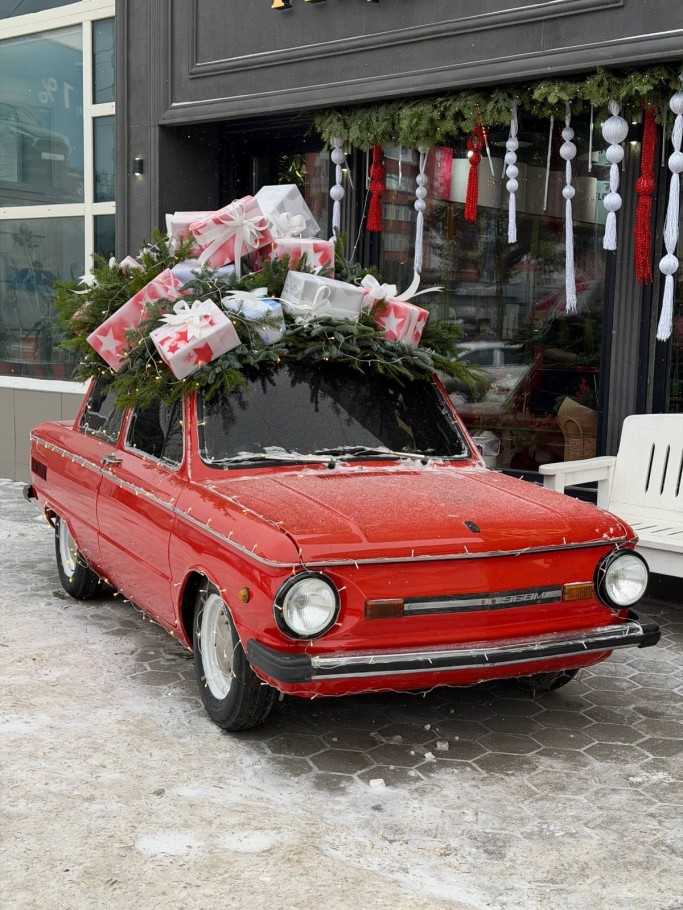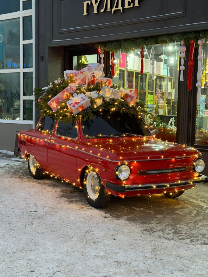 По этой причине напротив Русского драматического театра красуется красный «Запорожец» в гирляндах, с подарками на крыше, живыми ветками норвежской ели и пихты.
