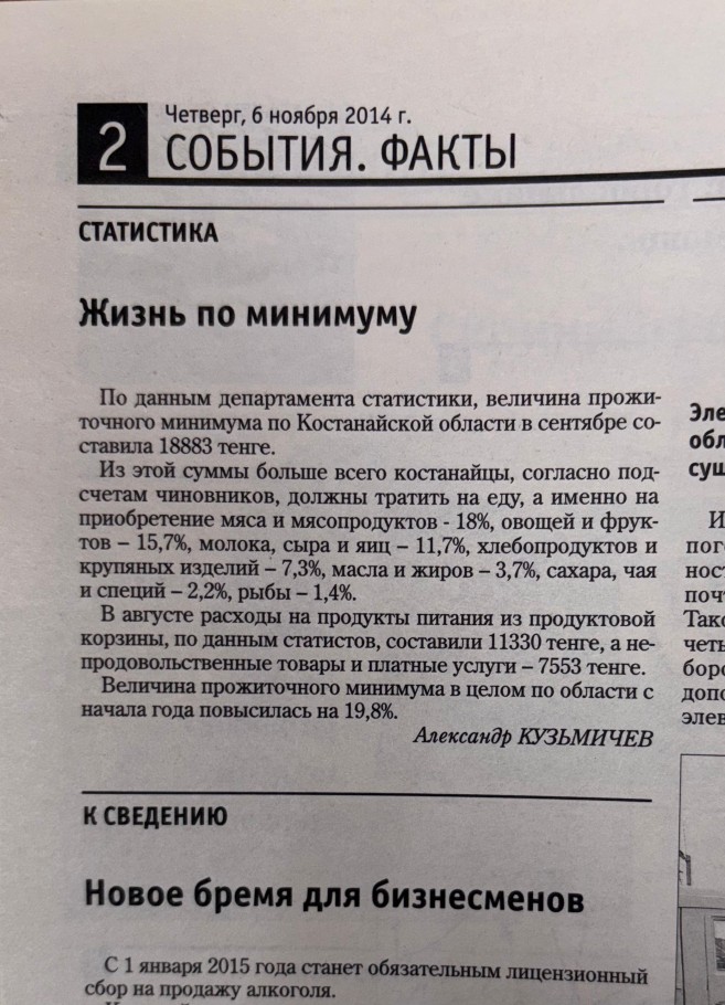 Переходим к информационным полосам. В 2014 году журналисты «НК» писали, что прожиточный минимум по Костанайской области составляет 18 883 тенге.