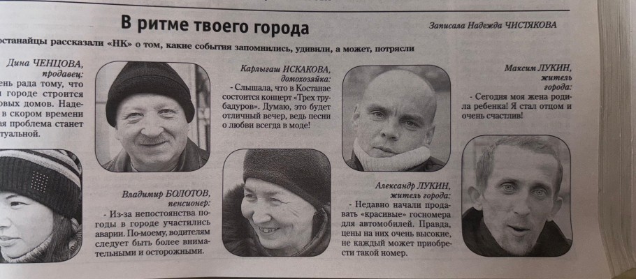 Интересная рубрика – стрит-опрос, в рамках которой костанайцы еженедельно отвечали, какие недавние события им запомнились. Так, костанаец Максим Лукин радовался рождению ребенка, Александр Лукин мечтал о красивых автомобильных номерах (услуга тогда только появилась), а пенсионер Владимир Болтов переживал из-за роста числа ДТП. Карлыгаш Искакова делилась предвкушением концерта «Трех трубадуров».