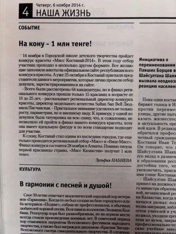 В 2014 году газета анонсировала конкурс красоты «Мисс Костанай-2014», где главный приз составлял 1 миллион тенге – сумма впечатляющая даже по нынешним меркам.