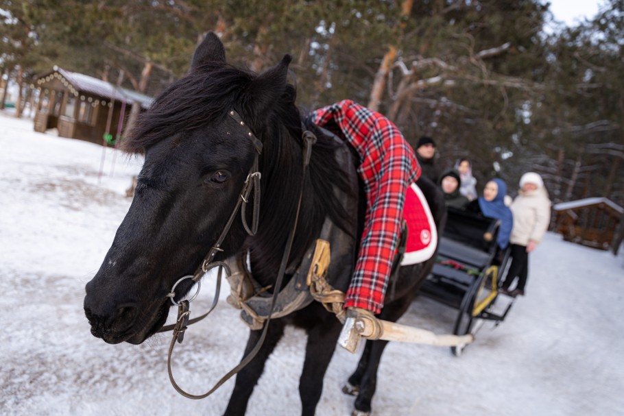 – Аллюра мы привезли недели три назад из Заречного. Он взрослый – ему восемь лет. Конь спокойный и не шугливый, может катать детей верхом. В санях ему тоже комфортно, – рассказали сотрудники зоны отдыха.