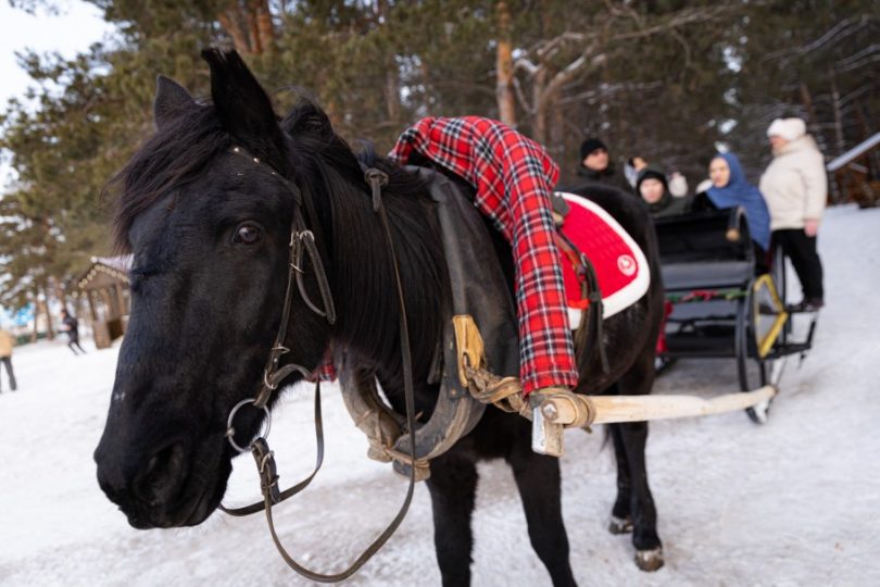 – Аллюра мы привезли недели три назад из Заречного. Он взрослый – ему восемь лет. Конь спокойный и не шугливый, может катать детей верхом. В санях ему тоже комфортно, – рассказали сотрудники зоны отдыха.