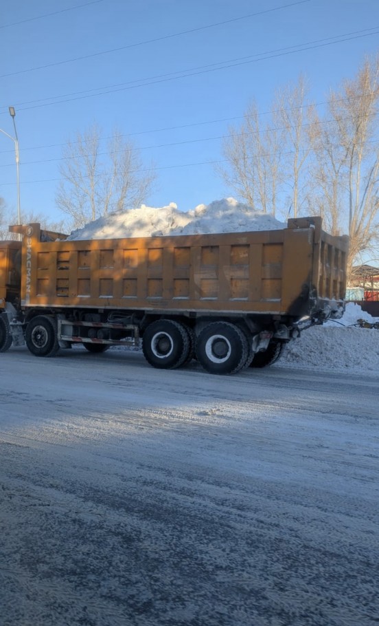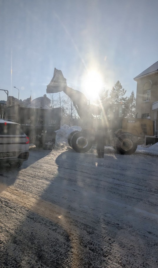 На улице Воинов-Интернационалистов активно работала техника как на дороге, так и на тротуарах. Здесь же стояли самосвалы, в которые грузили снег.