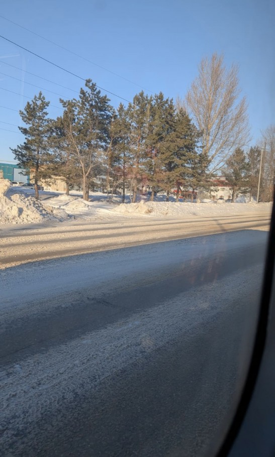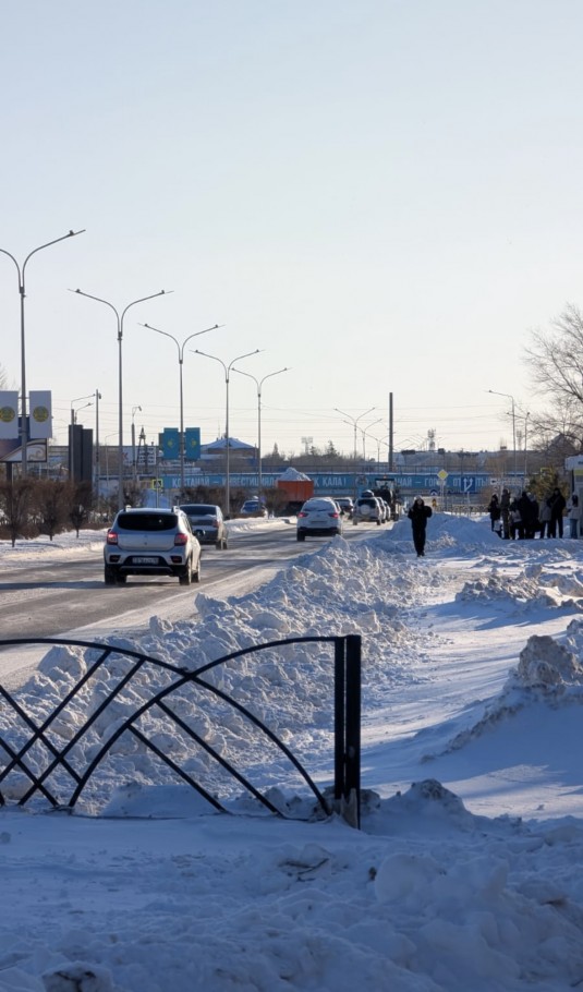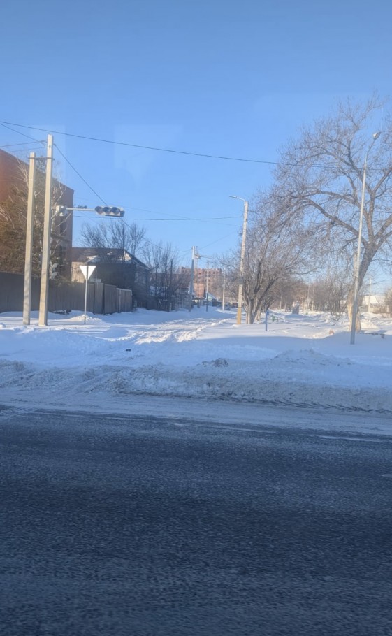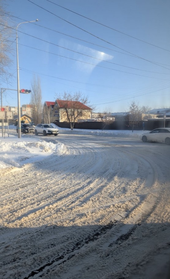 А вот на ул. Баймагамбетова в районе тубдиспансера ситуация с очисткой похуже. Полосы для движения очищены, по ним можно нормально ехать, но снег занимает большую часть обочин. Вместо тротуаров — тропы, к остановкам подъезжать сложно, снег не до конца убран.