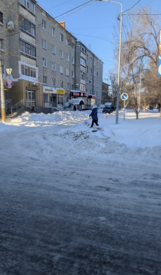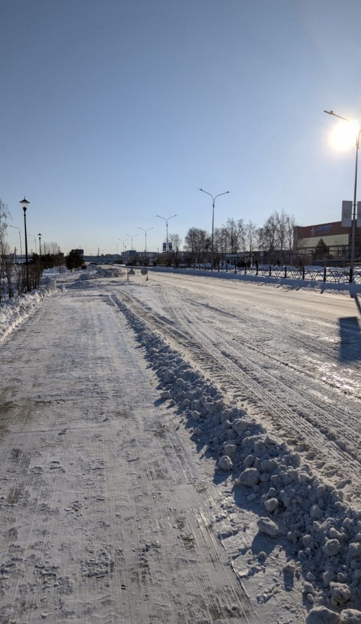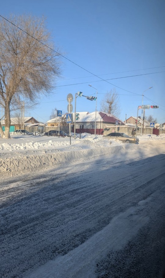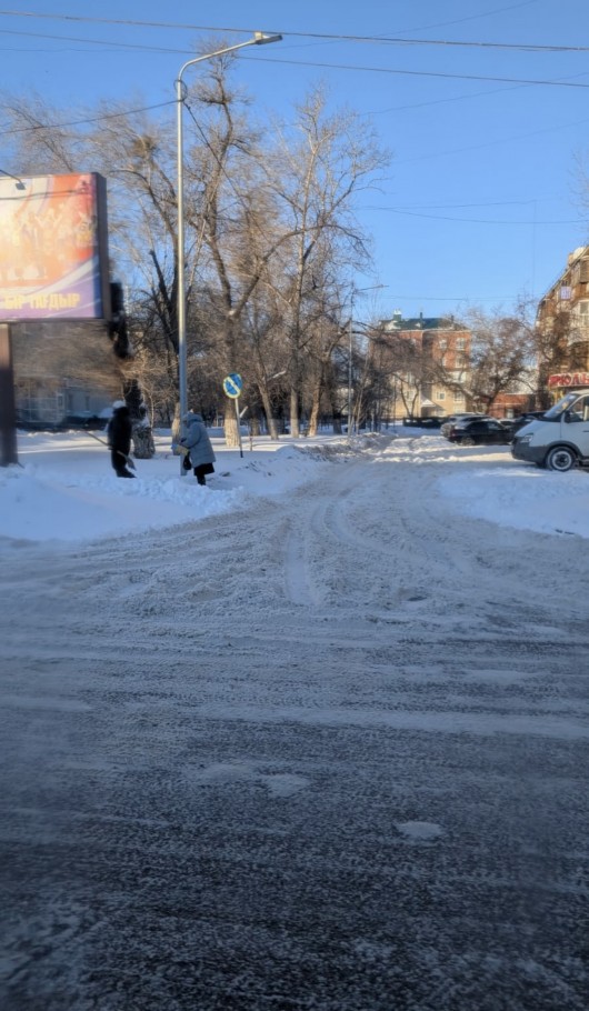 Движение я начала с улицы Арыстанбекова. Дорога хорошо очищена: с одной стороны уже пробиты тротуары и выходы с них на пешеходные переходы, с другой — техника еще не проходила.