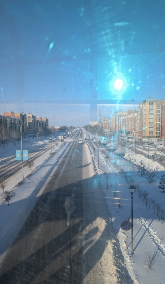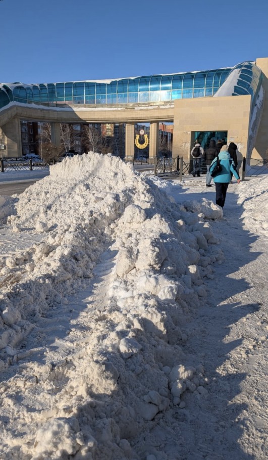 Проспект Аль-Фараби пробит от снега, но очищен плохо. На дороге — колдобины, на обочинах много снега, на тротуарах местами очищенные дорожки, местами — тропы, которые протоптали люди. Есть и чистые площадки, которые убрали владельцы зданий.
