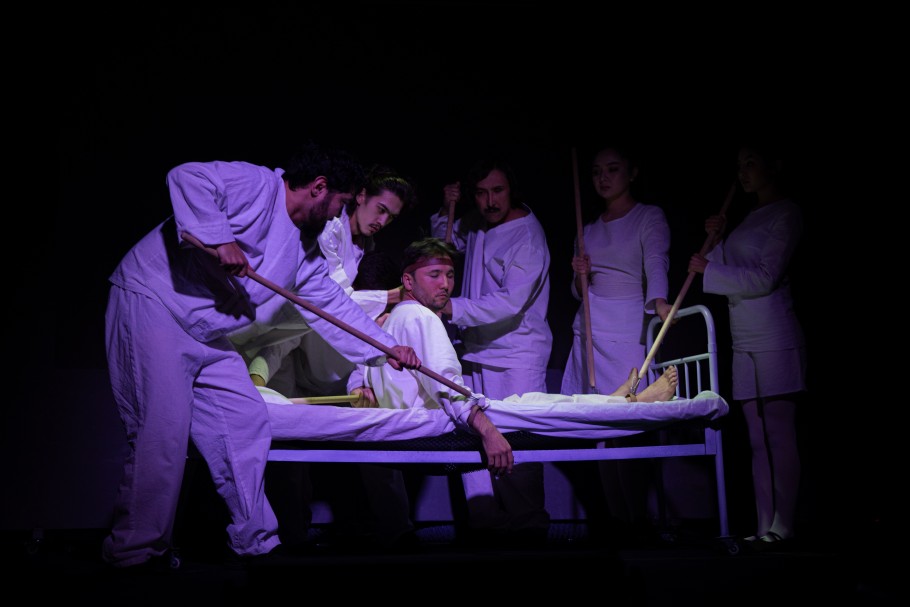 Главную роль Аксентия Поприщина исполнил руководитель театра Толенды Альгожин. Его герой уязвим, резок, временами пугающе откровенен. По сути спектакль представляет собой монолог человека, которого так и не приняло общество.