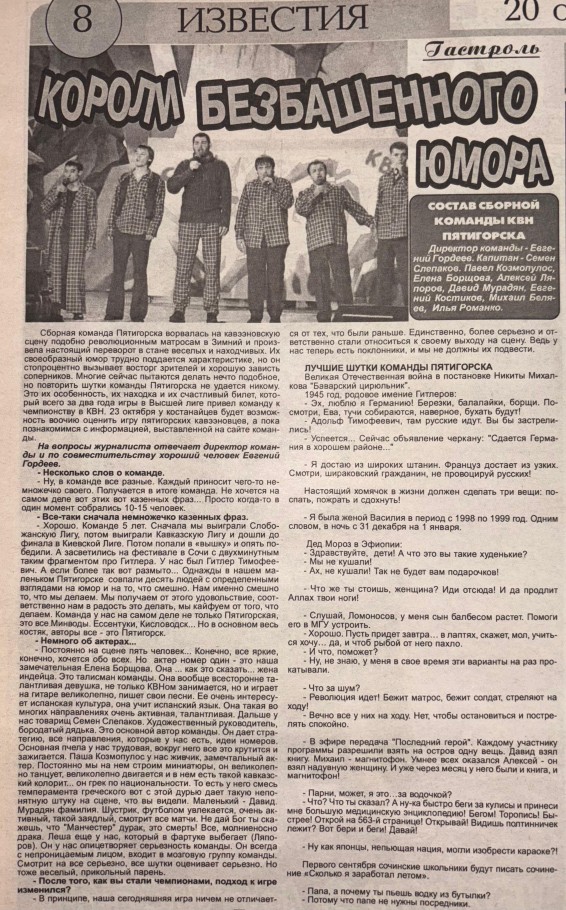 На культурной странице можно встретить знакомое имя — Семен Слепаков. В октябре 2005 года он приезжал в Костанай в составе кавээн-команды Пятигорска.