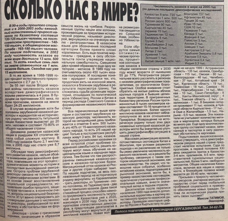 В этом же номере газеты размещена статья «Сколько нас в мире?», где авторы размышляли о численности казахов за рубежом. По данным 2005 года, в мире насчитывалось 15 миллионов казахов: из них 8,7 миллиона — в Казахстане, 1,5 миллиона — в Узбекистане, 1 миллион — в Китае и около 800 тысяч — в России.