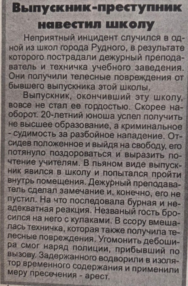 На информационной полосе размещена заметка криминальной хроники, которая могла бы лечь в основу сценария фильма. Выпускник одной из школ Рудного, находясь в состоянии алкогольного опьянения, ворвался в здание учебного заведения и избил дежурного учителя и техничку. Как выяснилось, 20-летний злоумышленник к тому моменту уже имел судимость за разбойное нападение. После повторного преступления он снова оказался под арестом.