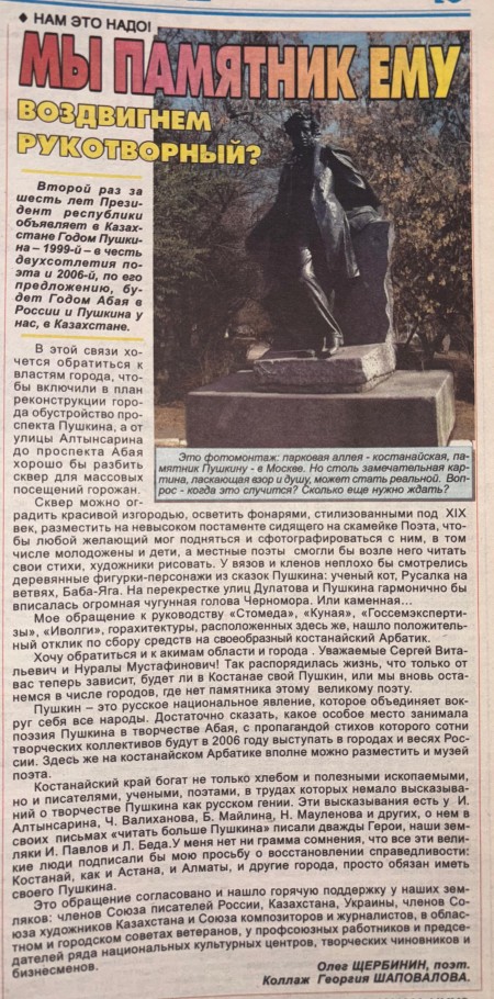 Любопытной деталью выпуска стало обращение костанайского поэта Олега Щербинина к акимам города и области. Он предлагал благоустроить сквер на улице Пушкина и превратить его в «костанайский Арбатик» — с фонарями, скамейками, зелеными изгородями и памятником великому русскому писателю. Идея воплотилась, но лишь спустя пять лет — в сентябре 2010 года в сквере открыли памятник Александру Пушкину, подаренный Союзом писателей России. Весной 2025 года «НК» писал, что из рук памятника пропало перо. Позже отдел ЖКХ в ответе на запрос сообщил, что памятник Пушкину и вовсе не состоит на балансе государственного учреждения и числится как бесхозяйное имущество.