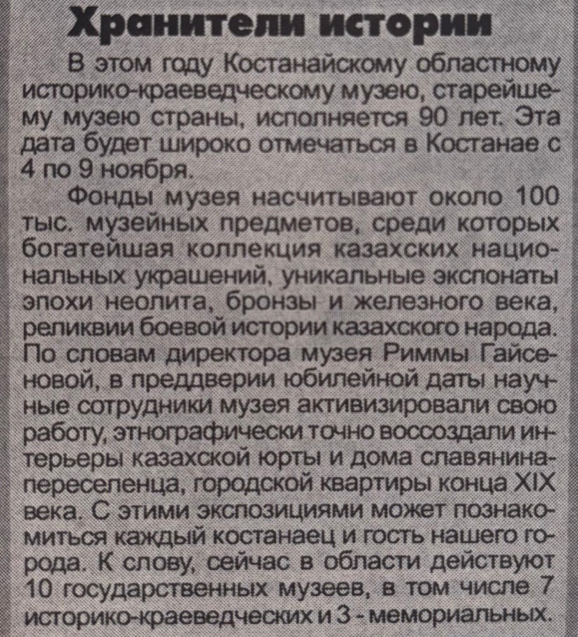 На этой же полосе — заметка о том, что в октябре 2005 года Костанайский областной историко-краеведческий музей отмечал 90-летие. Сегодня, в 2025 году, учреждение готовится к 110-летнему юбилею, но без торжеств. А все потому, что внутри здания идет капитальный ремонт, начавшийся в начале года. Наружные работы по реставрации фасада и кровли завершились в 2024 году.