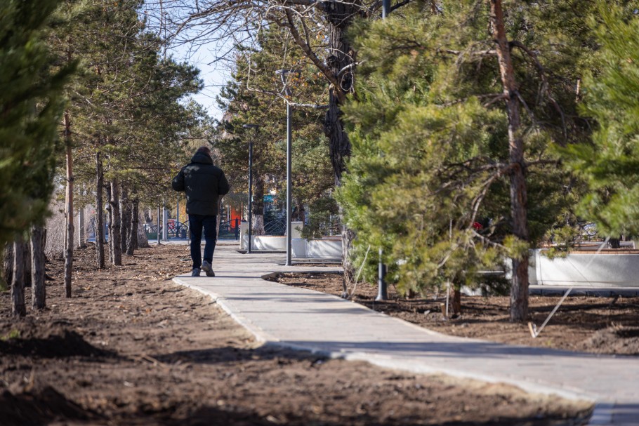 В новом парке уже высажены деревья и кустарники, уложена брусчатка, установлены скамейки, урны, клумбы, беседки, а также появилось новое освещение и современная система полива. Стоимость проекта составляет 110,3 миллиона тенге. Весной он станет еще зеленее, так как будет высажен газон.