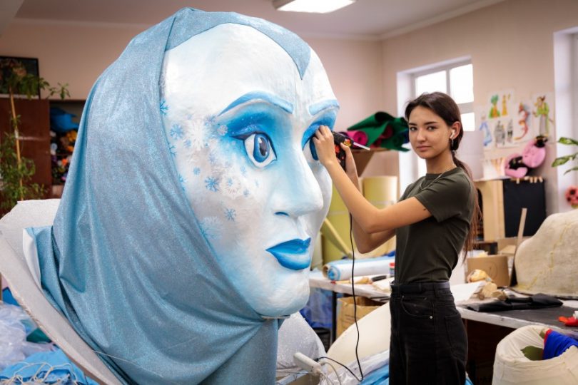 – Она у нас гигантская, будет двигаться по сцене. Голова сделана из папье-маше, сейчас надеваем на проволочный каркас, – рассказывает главный художник.