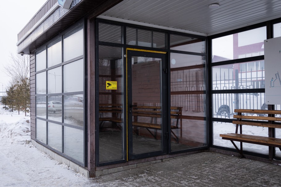 На остановке «Мясокомбинат» по пр. Кобыланды батыра людей не оказалось вовсе – ни внутри, ни снаружи. В павильоне тепло, чисто, без посторонних запахов. Замок тоже на месте, в отличие от центральных «ожидалок». Остановка выглядит ухоженной, вероятно, из-за меньшего пассажиропотока.