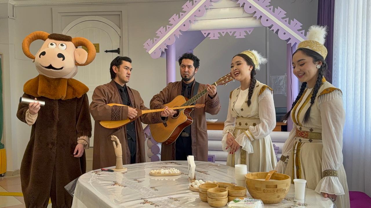 Переступая порог театра, понимаешь — сегодня здесь что-то особенное. У входа всех гостей встречает счастливый коллектив, зазывающий внутрь, и красивые девушки в национальных костюмах: на столе расставлены пиалы с куртом, а взгляд цепляют переливающиеся узоры традиционных нарядов. Рядом гитарист и домбрист наигрывают мелодии, женские голоса мягко подхватывают. А чуть поодаль двое в костюмах баранов суетятся, смешат, заигрывают с гостями, развлекая всех присутствующих.