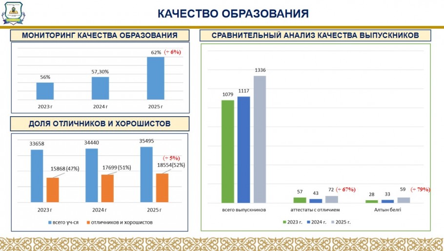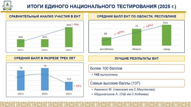 — Одной из основных причин снижения среднего балла стало значительное увеличение числа выпускников, принявших участие в ЕНТ. В этом году их количество выросло на 230–260 человек (или на 3%) по сравнению с предыдущими годами, что составило 89% от общего числа выпускников (1191 из 1336). Несмотря на это, город гордится своими лучшими учащимися. Самый высокий балл по области в текущем году — 137, столько набрали три человека, двое из которых — выпускники костанайских школ: Аманжол Маргулан из гимназии имени Сырбая Мауленова и Абдыкаликов Альмансур из школы имени Кобеева. В целом более 100 баллов набрали 142 выпускника, что составляет 11% от общего количества участников ЕНТ, — сказала руководитель отдела образования Гульсим Уразбаева.