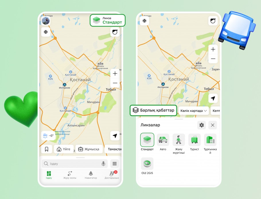 Қала ішінде қозғалу әлдеқайда ыңғайлы, ал күнделікті өміріңіз жеңіл болу үшін 2ГИС-ті толықтай пайдаланыңыз!