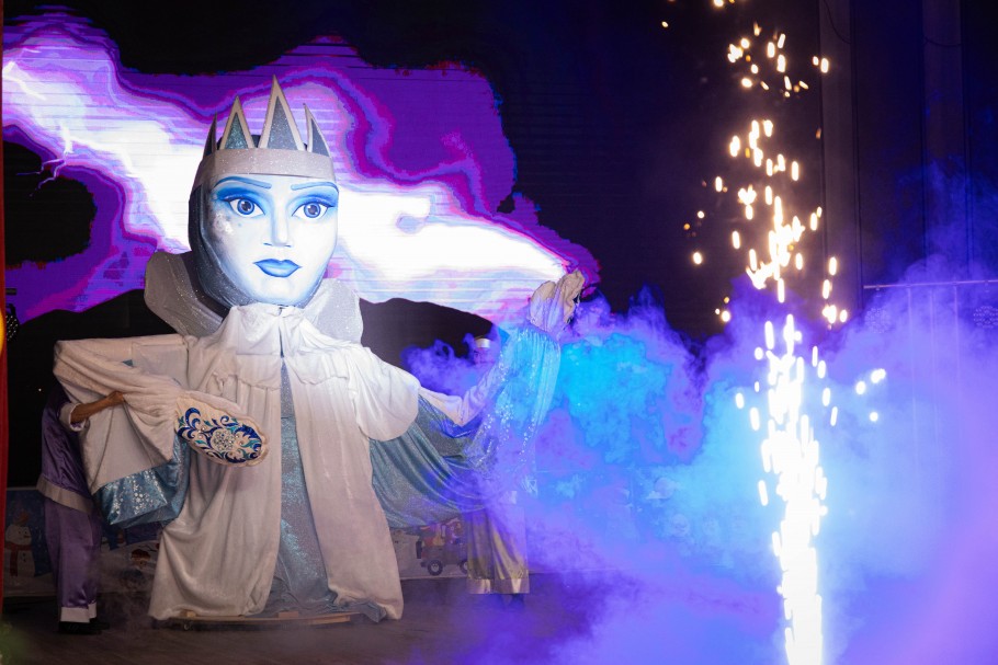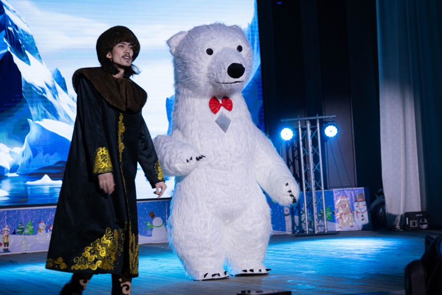 Для гостей подготовили яркое театрализованное представление. В постановке приняли участие актеры областного кукольного театра и театральной студии ГШДТ, подарив зрителям настоящий праздник, полный улыбок, света и новогоднего настроения. Вместе со сказочными героями – северным мишкой и пингвином – ребятам предстояло отправиться в большое путешествие вокруг света, чтобы отыскать северное сияние, похищенное Царицей Ночью. На пути им встречались и злодеи, и добрые герои, но, пройдя все испытания, дети смогли победить зло и радостно встретить Новый год.