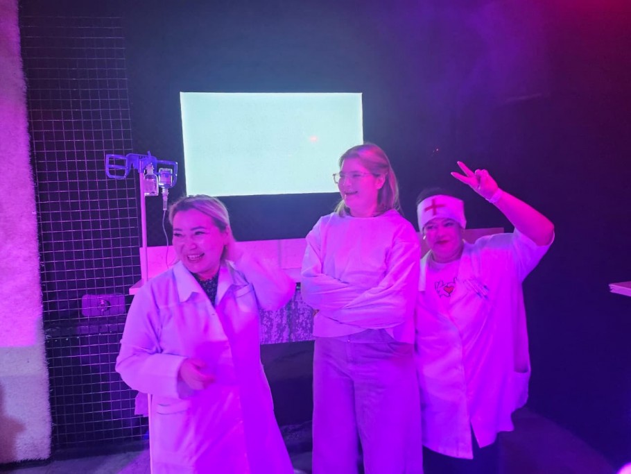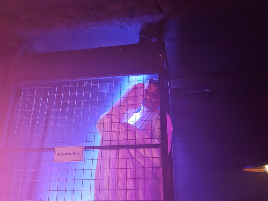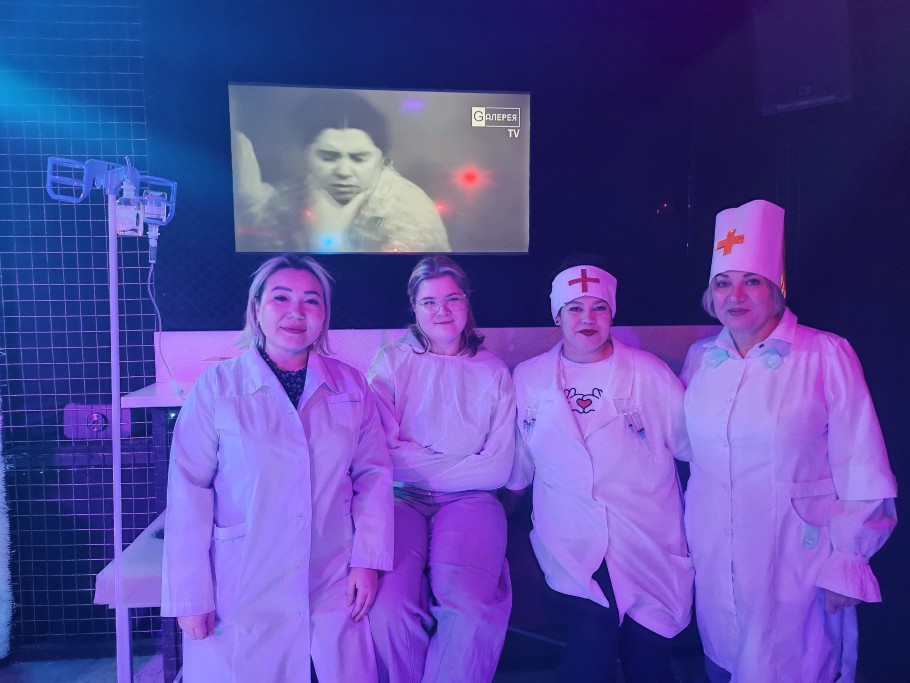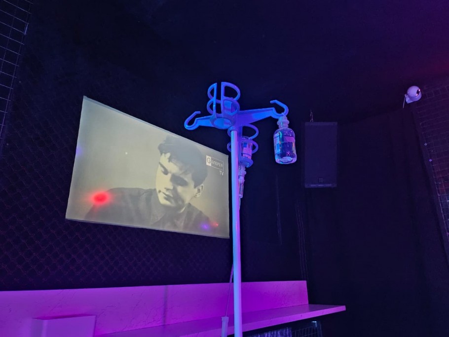 На экране телевизора транслировались тематические кадры, из бутафории были кушетка и капельница, а также присутствовали аниматоры в одеяниях, подходящих дресс-коду, сшитых специально для вечеринки местным модельером-закройщиком Анастасией Лесниковой.