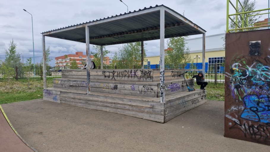 В конце июня текущего года корреспонденты «НК» побывали в парке «Керуен». Тогда мы обратили внимание на то, что спецплощадка исписана граффити. Сами конструкции выглядели небезопасно: металл проржавел, а стыки между элементами разошлись.