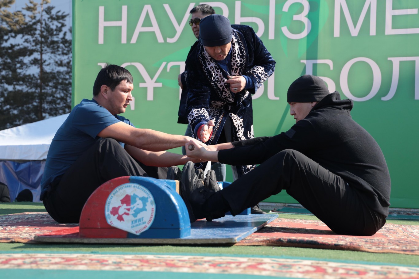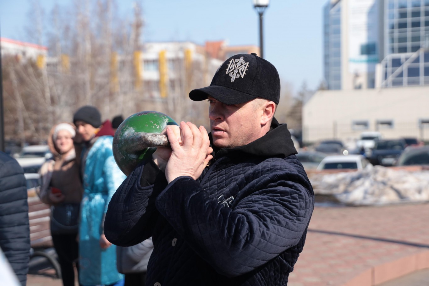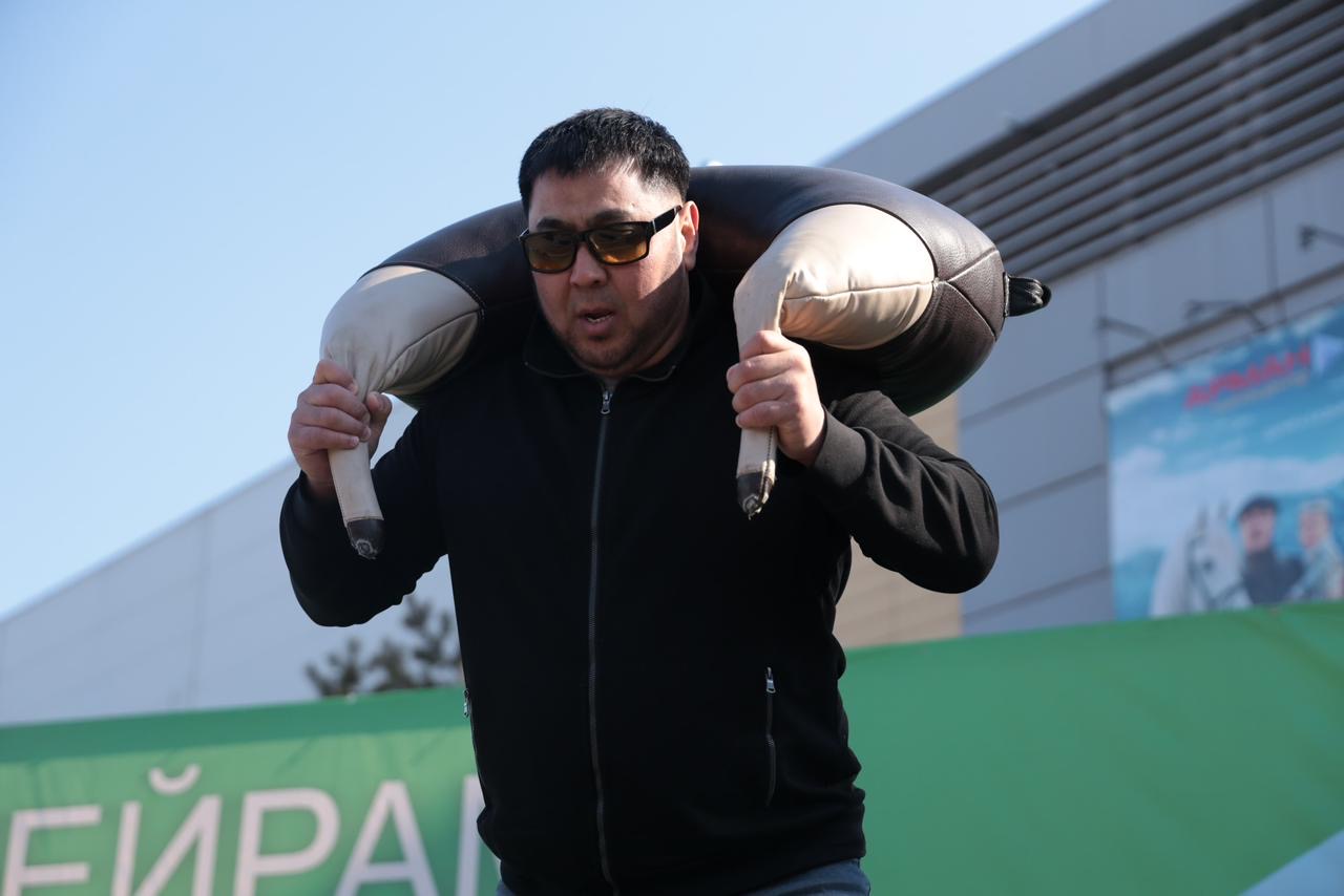 Мужчины выходят помериться силой в «Қой көтеру». Вес «барашка», с которым нужно приседать, — 70 кг.