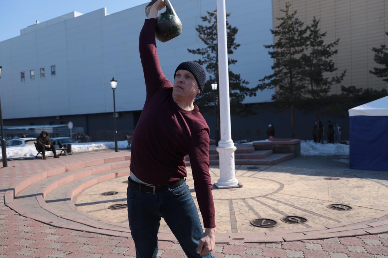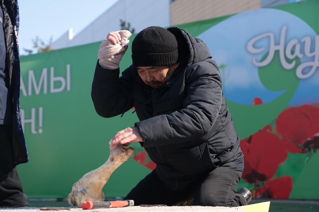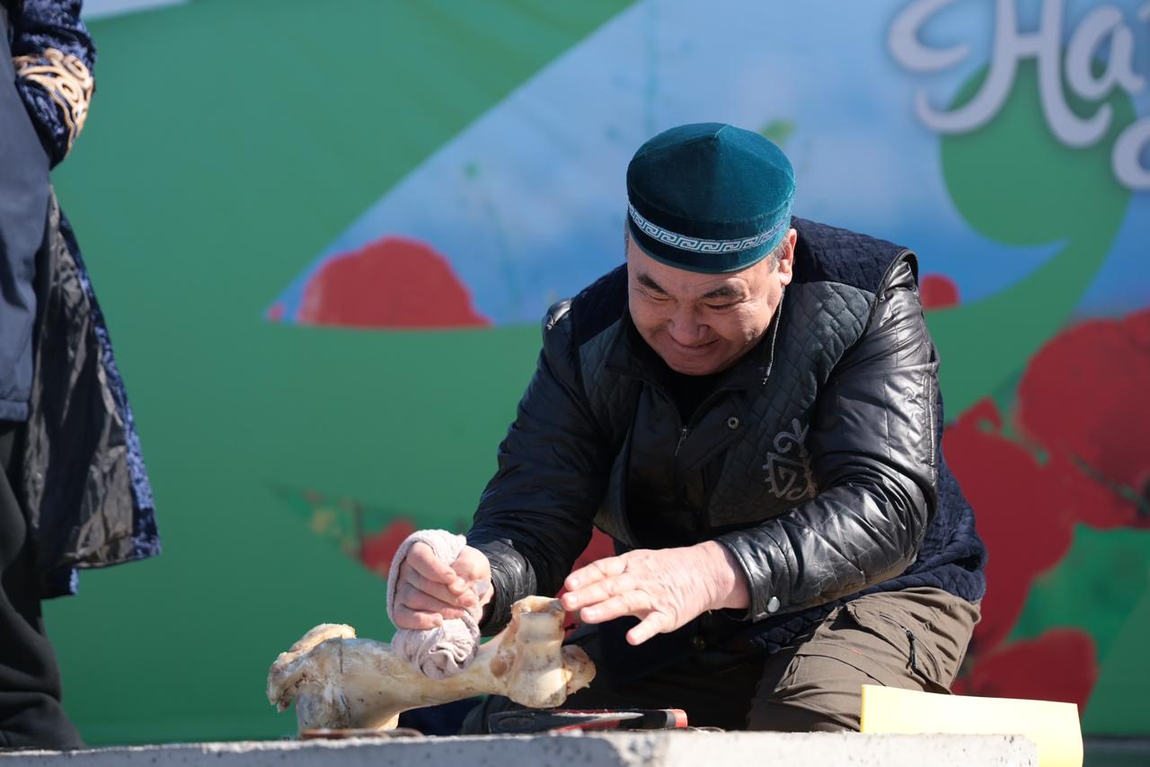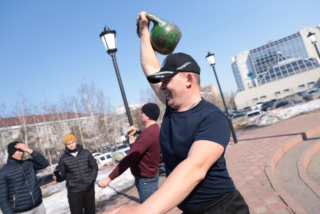 Мужчины выходят помериться силой в «Қой көтеру». Вес «барашка», с которым нужно приседать, — 70 кг.
