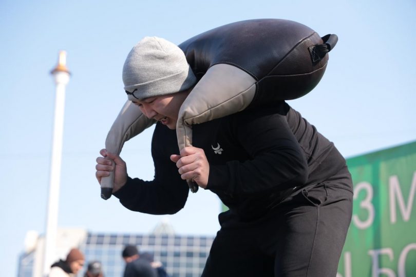 Мужчины выходят помериться силой в «Қой көтеру». Вес «барашка», с которым нужно приседать, — 70 кг.