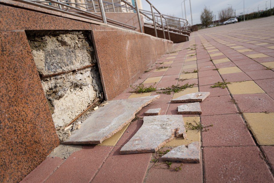 Здание в целом в хорошем состоянии, однако журналисты «НК» заметили ряд мелких, но существенных дефектов: на большой лестнице у входа начали разрушаться ступени, в некоторых местах отвалилась облицовочная плитка, а на отдельных участках фасада отслаивается краска.
