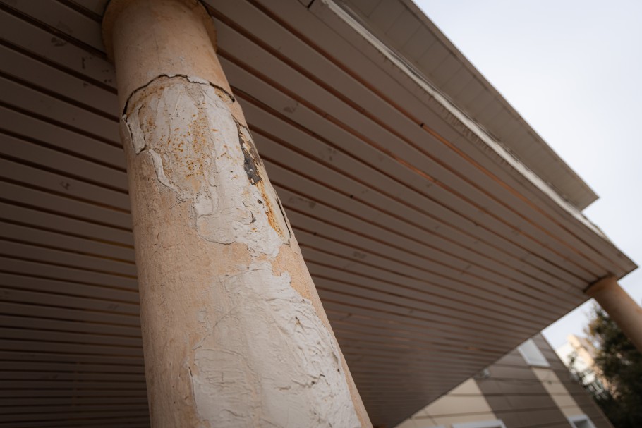 Журналисты «НК», побывавшие на объекте в рамках рейда, отметили ряд проблем: на фасаде начала отслаиваться краска, а металлические колонны на входе покрылись ржавчиной, что заметно портит внешний вид здания и создает ощущение запущенности.
