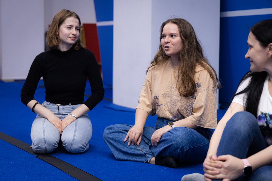 Когда проработали тело, плавно перешли к настройке голоса. Начали с повторения простых звуков, а закончили проговариванием скороговорок. В ходе упражнений мы учились слышать себя, не зацикливаться на том, как выглядим со стороны или на ошибках, которые совершаем, – главным было научиться чувствовать себя.