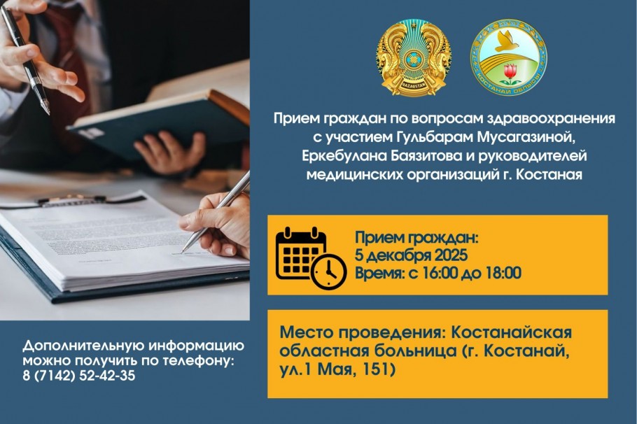 Как сообщили в управлении здравоохранения, прием граждан запланирован на 5 декабря с 16:00 до 18:00. Место проведения: Костанайская областная больница, ул. 1 Мая, 151.