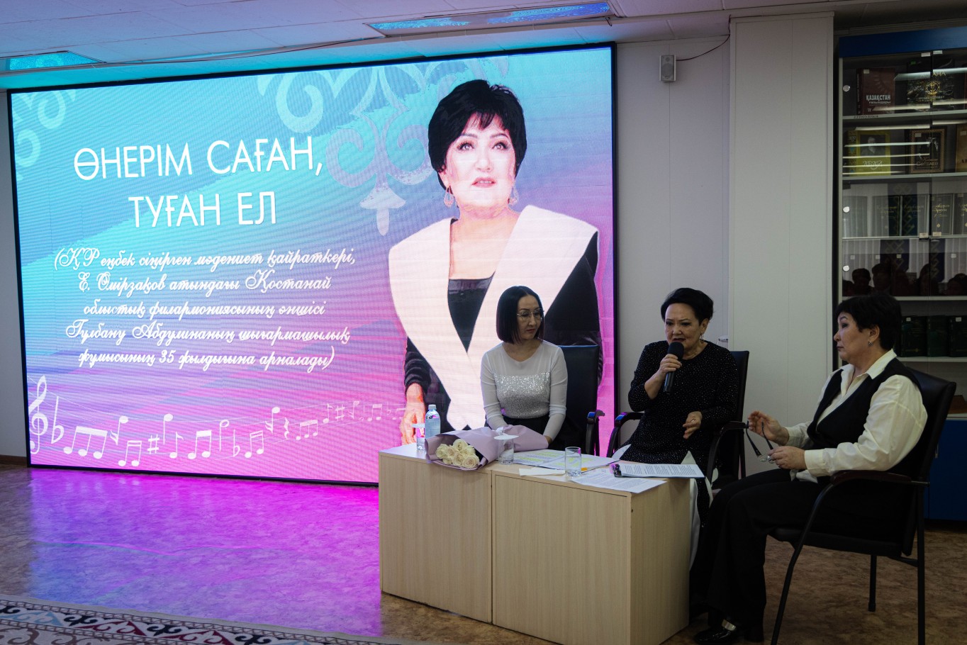 Встреча состоялась 4 марта в гостиной Костанайской областной универсальной научной библиотеки имени Л. Н. Толстого. Она была посвящена двойному юбилею солистки Костанайской областной филармонии имени Елубая Умурзакова Гульбану Абдулиной.