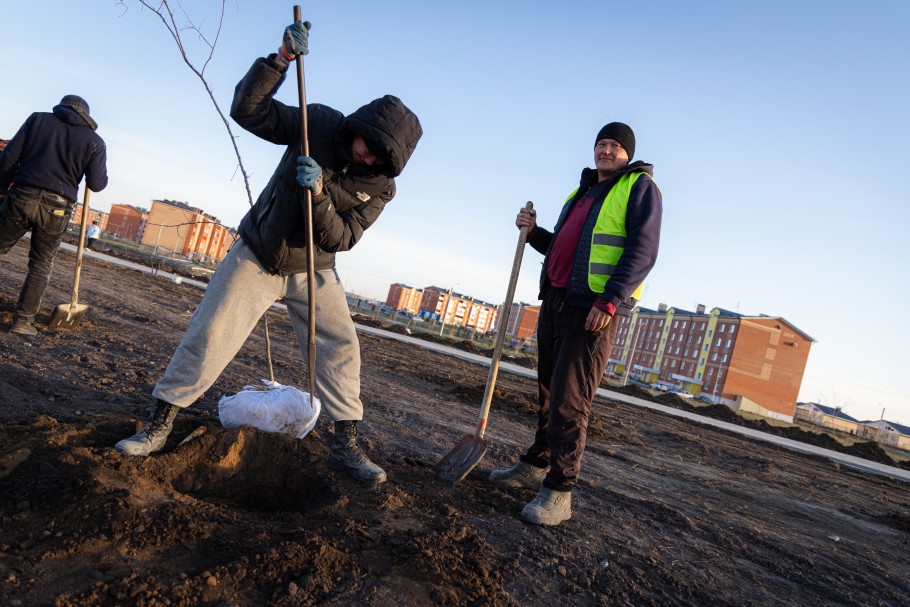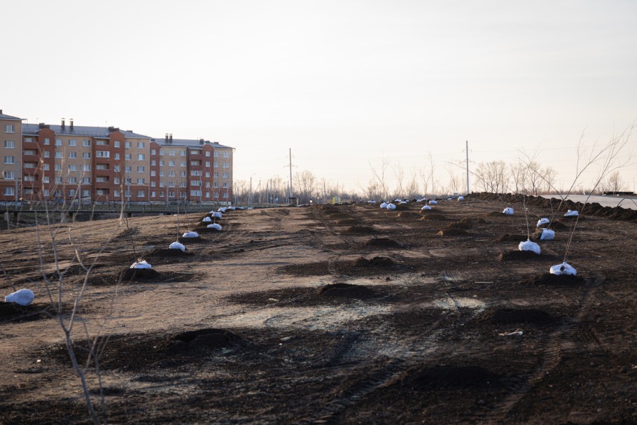 Во время нашего выезда в район в сквере активно высаживали деревья. Здесь будет 430 саженцев ивы, пирамидального тополя, вяза, 100 кустов сирени. Появится живая изгородь длиной 370 м (около 4400 саженцев).