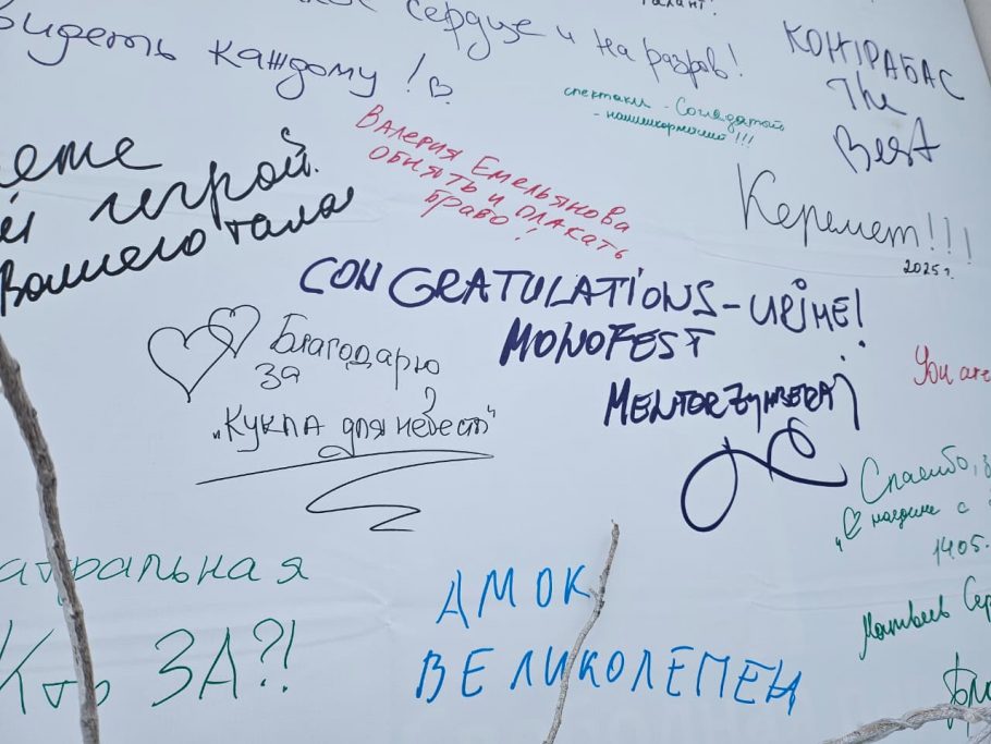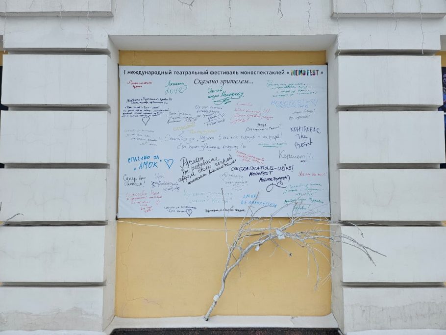 — Все это нам написали на Первом международном театральном фестивале моноспектаклей MONO FEST, проводимом нами в 2025 году, — рассказывали нам тогда в театре. — Люди от руки писали свои впечатления.
