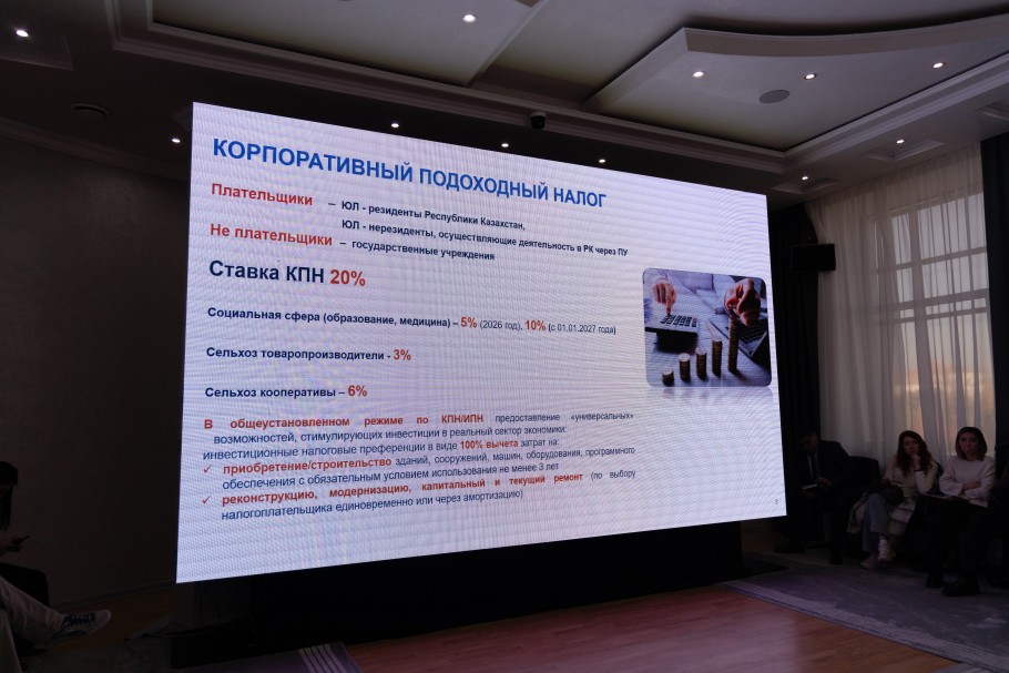 Далее он подробно остановился на КПН. В рамках нового Кодекса сохраняется базовая ставка КПН – 20%. Вместе с тем, для банковского сектора и игорного бизнеса устанавливается повышенная ставка – 25%. В свою очередь организации социальной сферы (образование, медицина, культура) получат льготную ставку – 5% в 2026 году и 10% с 2027 года.