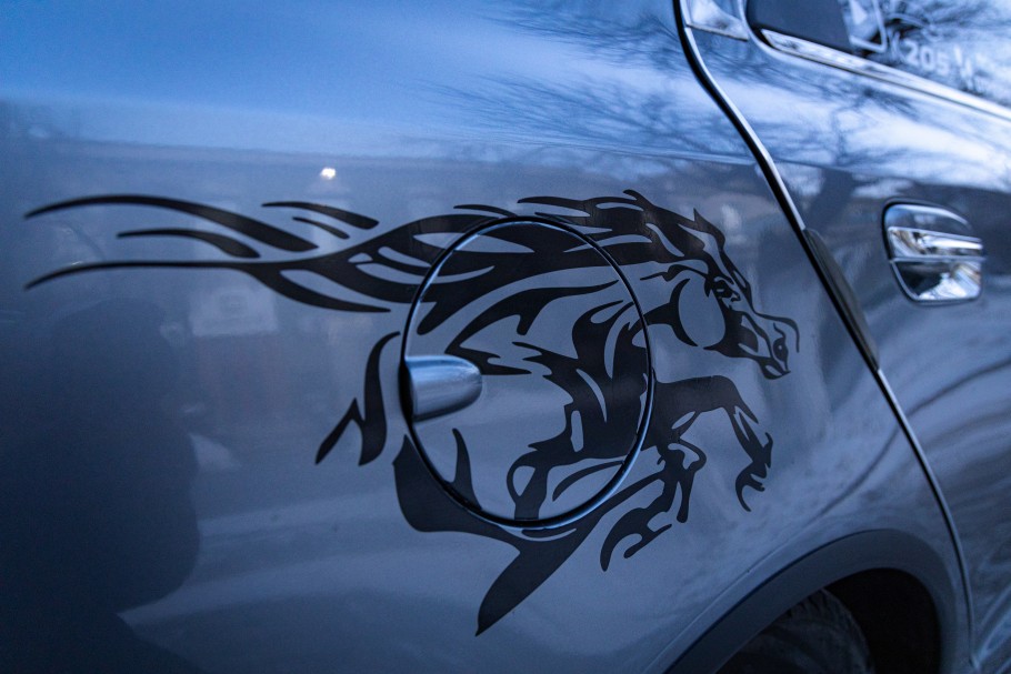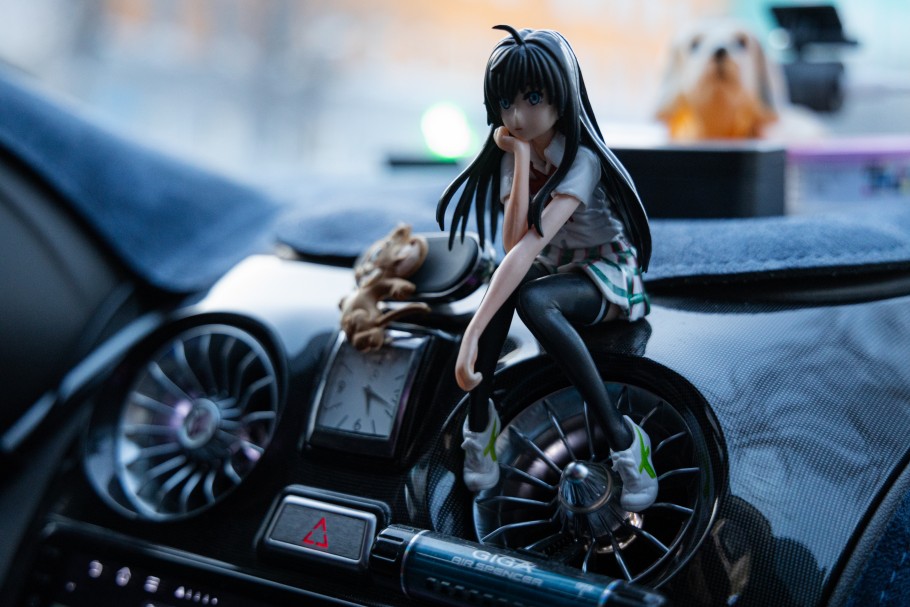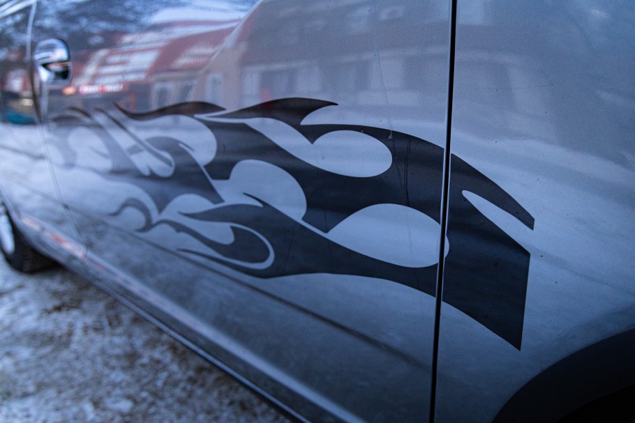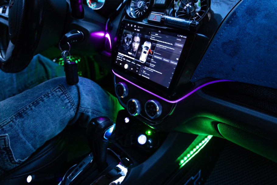 В салоне авто установлен прожектор, который украшает все вокруг космическим изображением, имеются наклейки «Не пить, не курить, не есть».