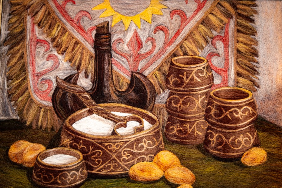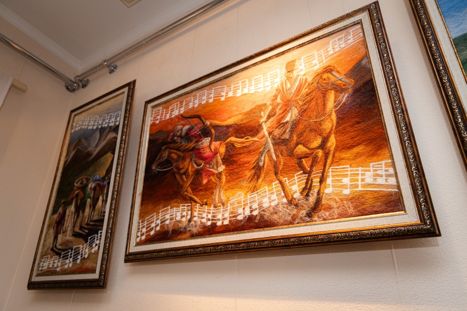 – Раньше мы ткали только орнаменты, а сейчас создаем целые картины, – поделилась Аби. – Из войлока мы изготовили триптих, на котором изображены ноты, по ним даже можно сыграть кюй «Адай».